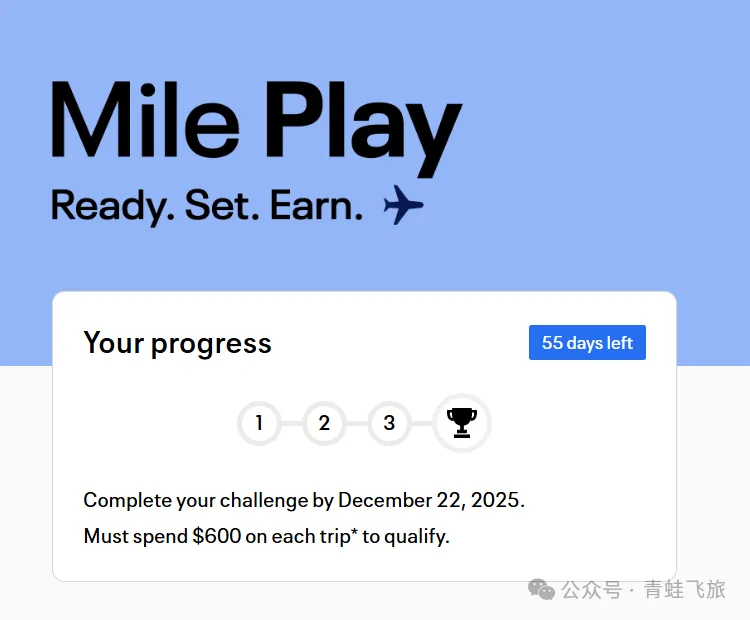 飞3次加赠59,000里程,但是要求不低,必须是票价$600+Premium以上舱位,如果是刚好要飞的话顺道做一下任务,但是如果纯粹为了完成活动的话不值。