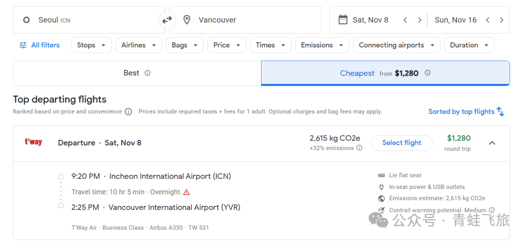 韩国廉航的德威航空推出了韩国首尔往返温哥华仅需$1100+的商务舱躺飞机票,7000+rmb这个价格在旺季单程经济舱都买不了,可以说是白菜价,11/12月份各个OTA平台如携程等大量日期有票,对于需要的人来说还是很不错的价格。