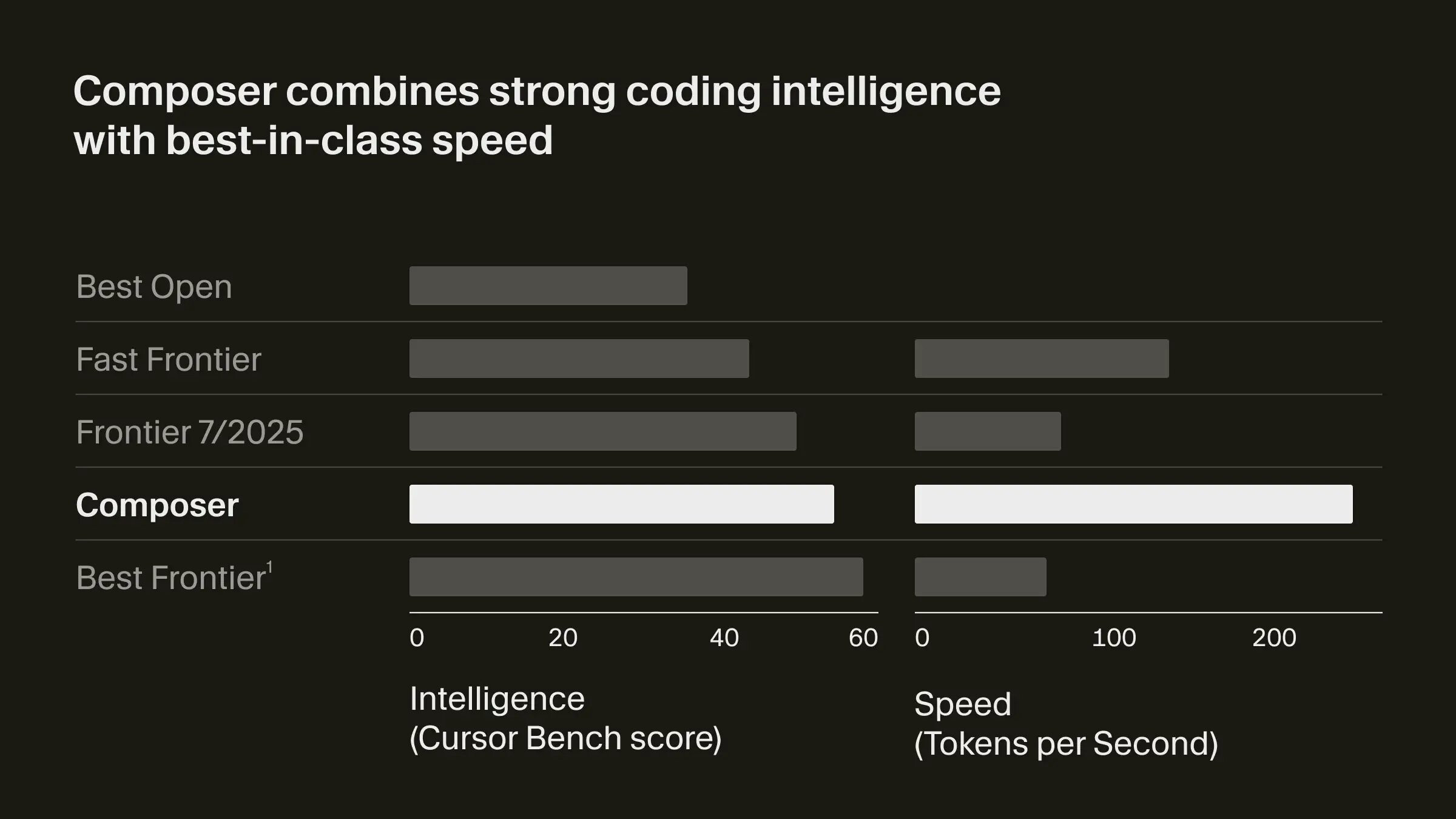 Composer的最大亮点在于其速度设计目标。他们在公告中称其速度“比同等智能的模型快4倍”。模型还专为Agentic工作流训练,支持由自主编码代理协同进行的规划、编写、测试与代码审阅。