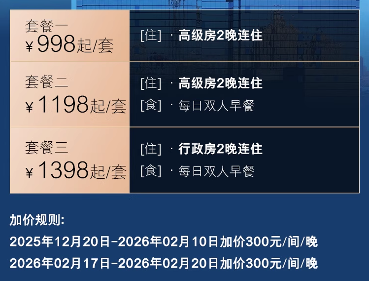 1. 哈尔滨索菲特大酒店,998/1198元享高级房2晚(有/无早均含SNP)。该套餐在12月下旬冰雪大世界开放后性价比飙升,春节期间仅加价300元,平均晚价仍具吸引力。