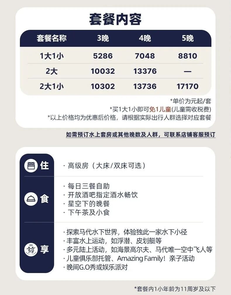 加上进岛和离岛交通,2大2小一共2万搞定,超级全面的一价全包,以CM的品质和服务,是马代的亲子首选。