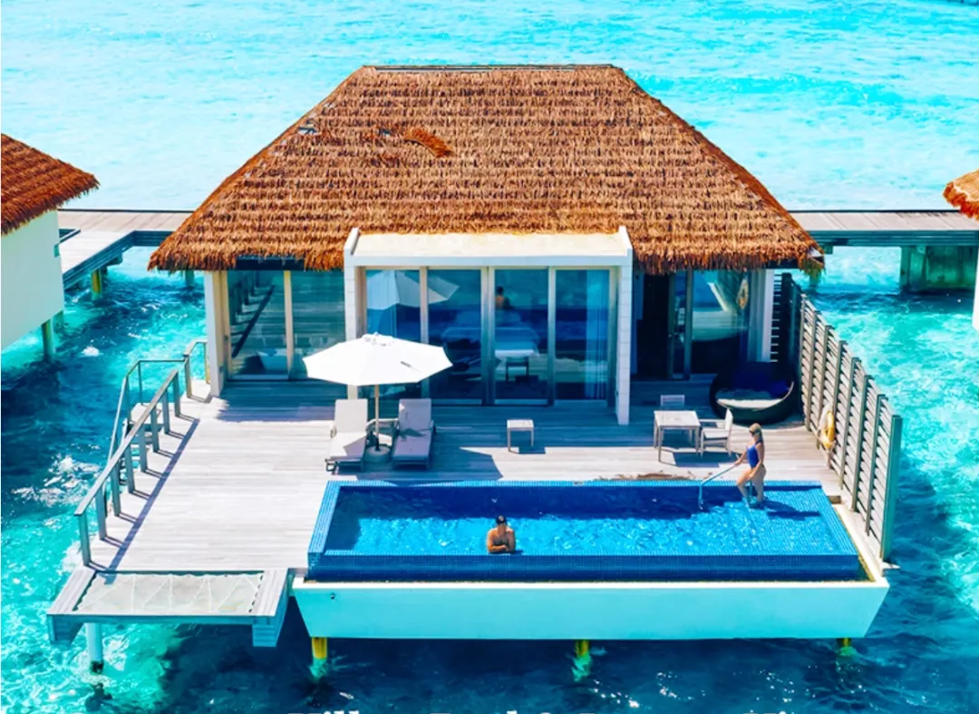 2019年开业,别墅面积150平米起步,拥有私人豪华泳池,双11专享可免费升级至日出水屋。这个套餐是SAI,一价全包,酒水畅饮。酒店拥有3家餐厅和2家酒吧,喜欢拍照可以飞无人机,酒店活动丰富,赠送多种权益。