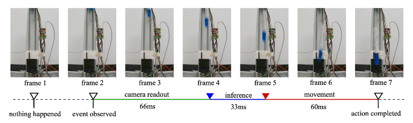 上图所示的任务是抓取一支自由下落的笔。 这个任务对反应时间的要求极为苛刻。机器人观察到笔开始下落后,必须在极短的时间内做出反应并在正确的时间启动抓取动作,快一点或者慢一点都会导致任务失败。