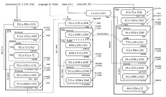 Pi0 模型计算流程图示,它主要包括 1 个视觉编码器,1 个编码器和 1 个解码器;所有这些又可进一步分解为一系列的矩阵乘法和标量运算。