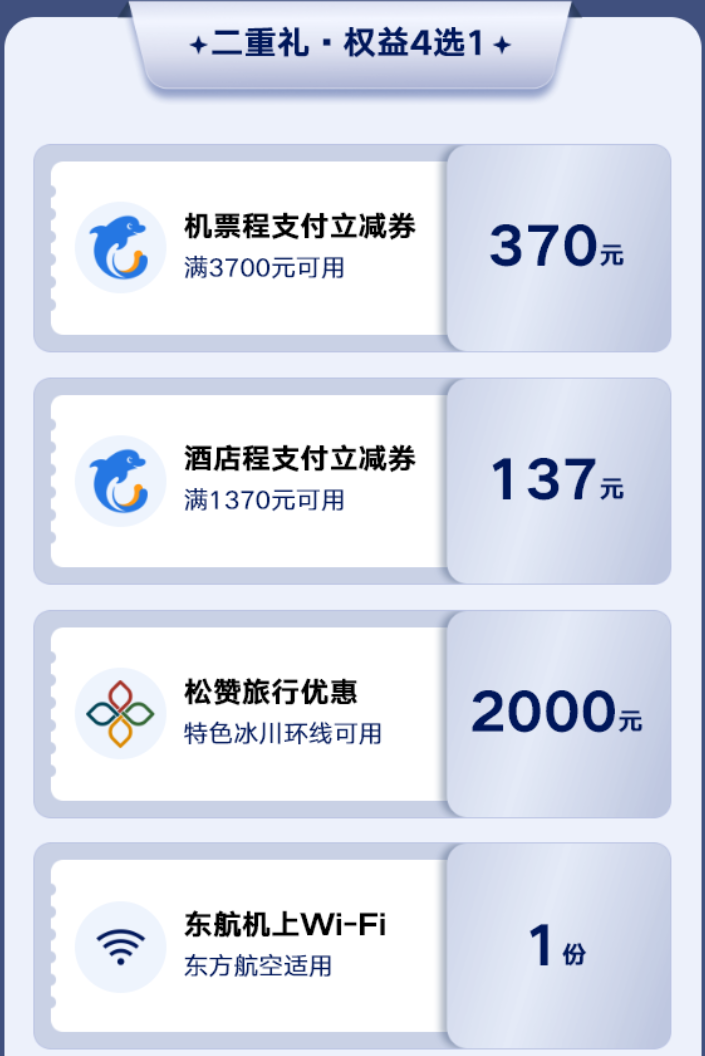 出行权益4选1:携程机票满3700减370元券、携程酒店满1370减137元券、松赞冰川之旅2000元优惠、东航机上Wi-Fi1份。