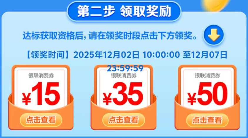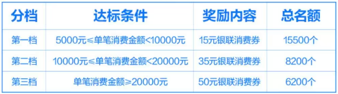 玩法:消费1笔5000领15,1笔1万领35,1笔2万领50。合计消费3.5万拿满100元银联消费券。名额较多,准点领取应该问题不大。