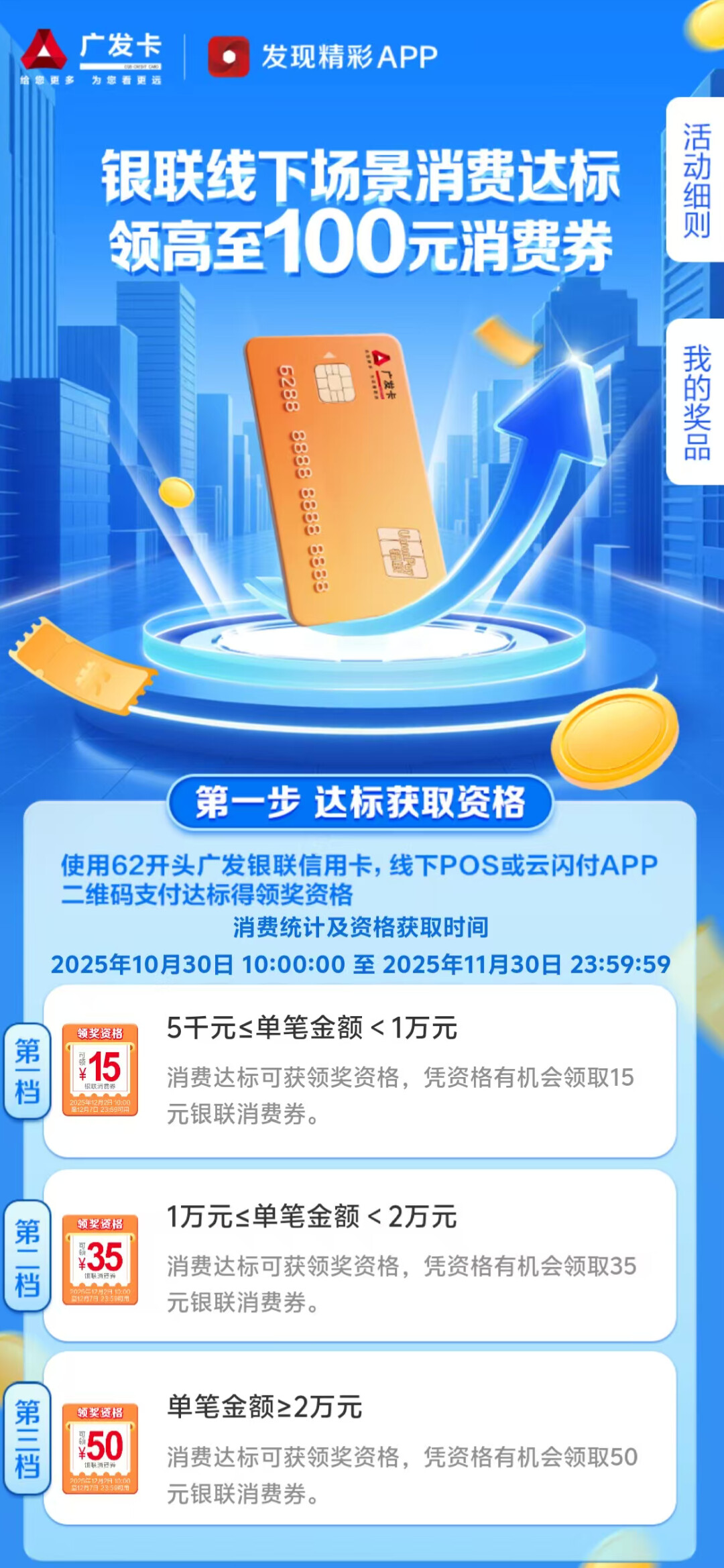 活动内容:活动期间,使用广发银联信用卡通过线下POS刷卡、云闪付APP二维码支付,单笔消费达标后有机会领取对应档次银联消费券,每人累计最高可领100元。