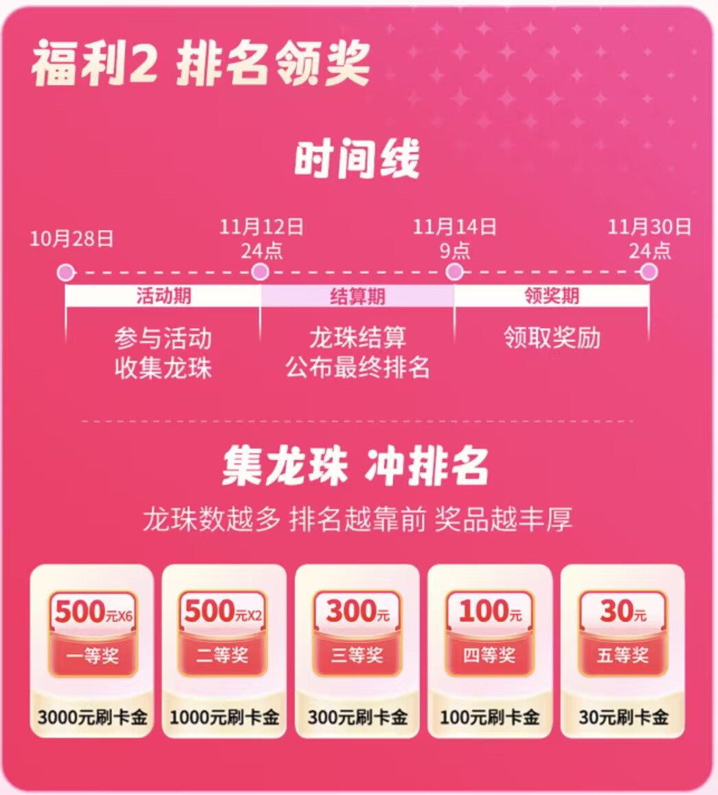 规则:活动结束后(11月12日),按用户累计龙珠总数从高到低排名,排名在对应区间即可获刷卡金,名额共12630个。
