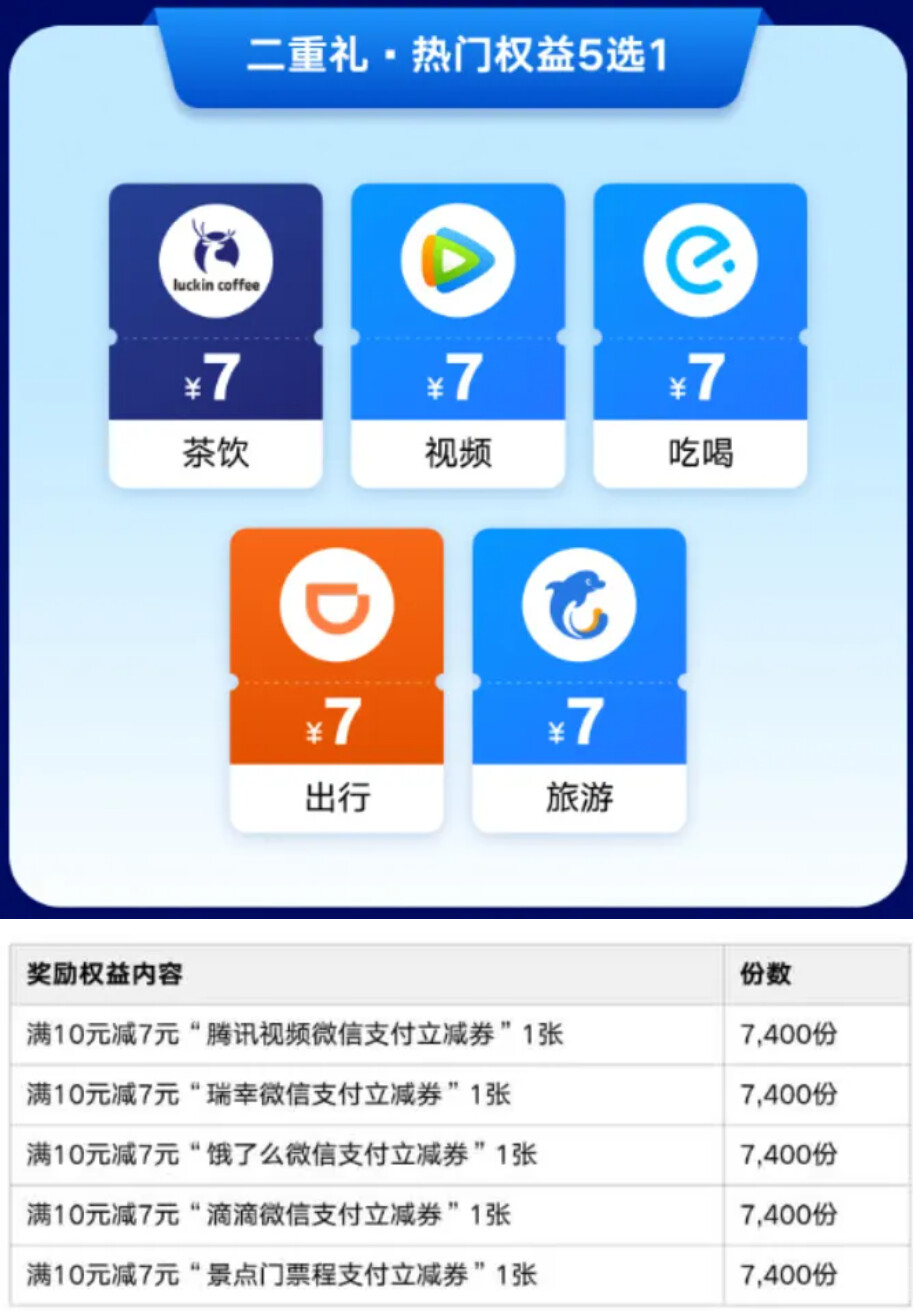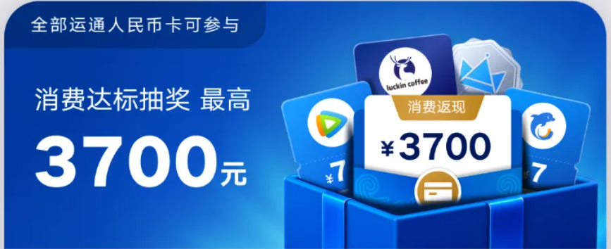 活动内容:完成月度任务(微信/支付宝合格消费满3700元,或合格境外消费满3700元):每月可获1个“惊喜蓝盒”(活动期最多3个),同时可参与“热门权益5选1”限量领取;