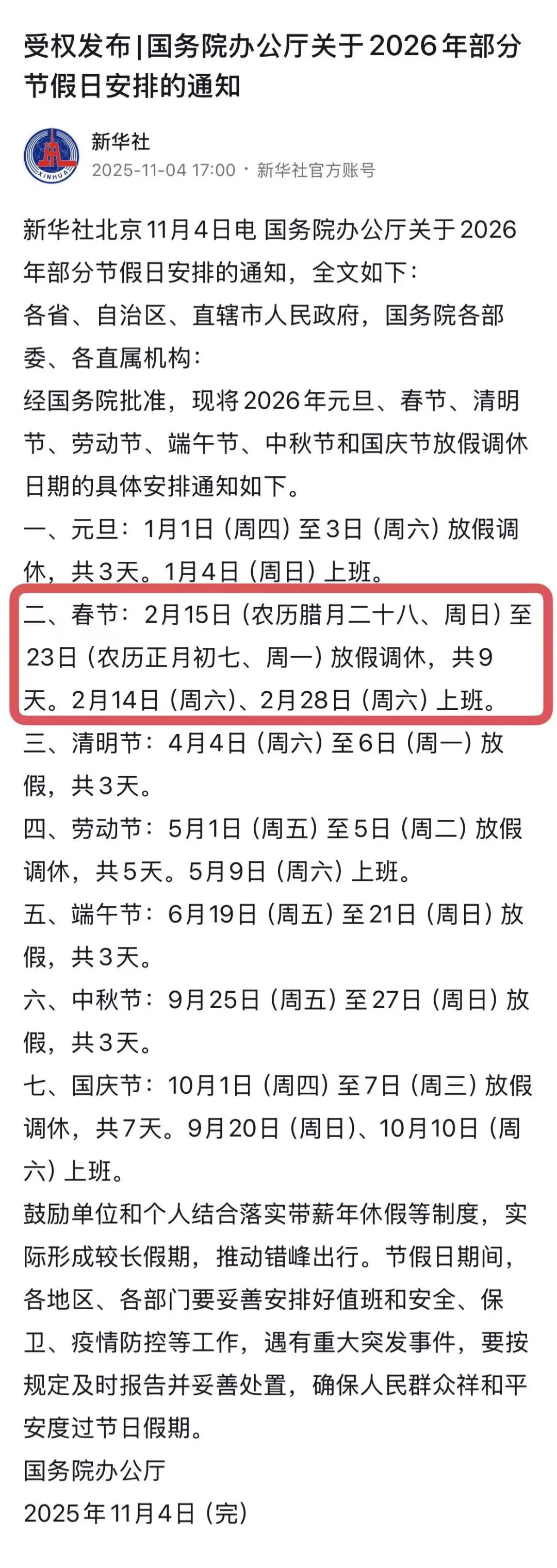 9天?!天呐,我可能真要好好回家躺9天。平时上班太累了,与其出去人挤人,不如在家陪陪父母,看看剧,约几个朋友打打麻将。如果非要出门,估计就是找个近郊的温泉酒店泡两天,安安静静的,把身心都放松下来。反正,对我来说,春节最重要的是和家人在一起。