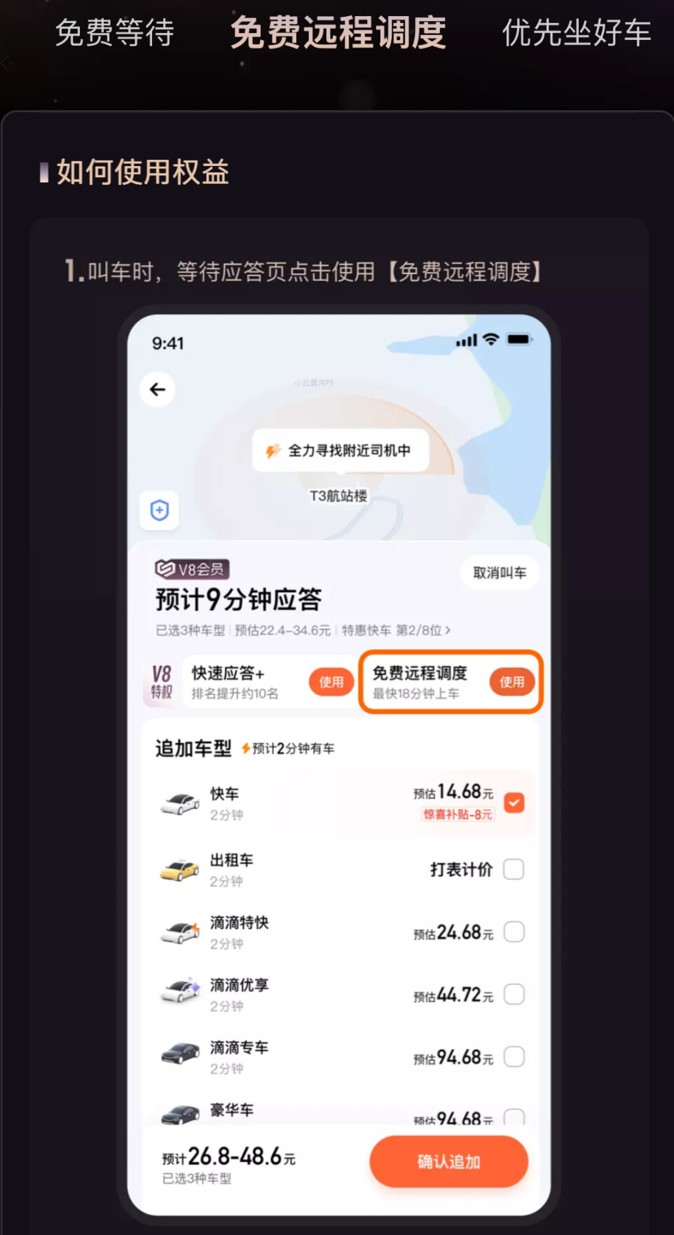 叫车时,“快速应答+”和“免费远程调度”提升叫到车的概率;
