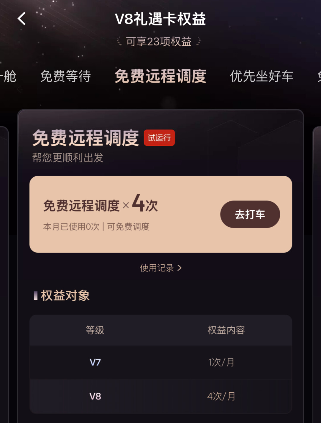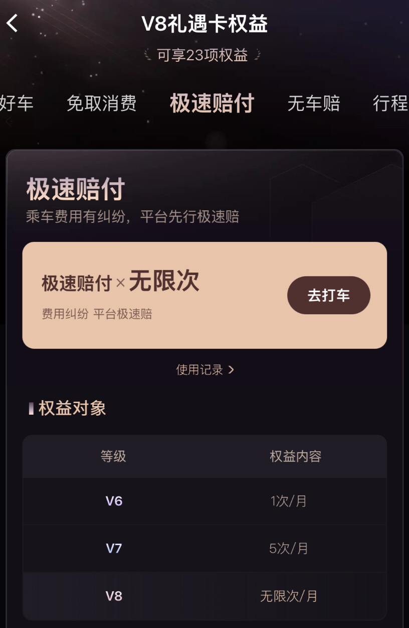 要是遇到“3分钟内没匹配到车辆”,V7每月5次、V8每月10次的“无车赔”就会触发,会赔付一张7折券,就算偶尔没叫到车,也能有点补偿,心里舒服不少。