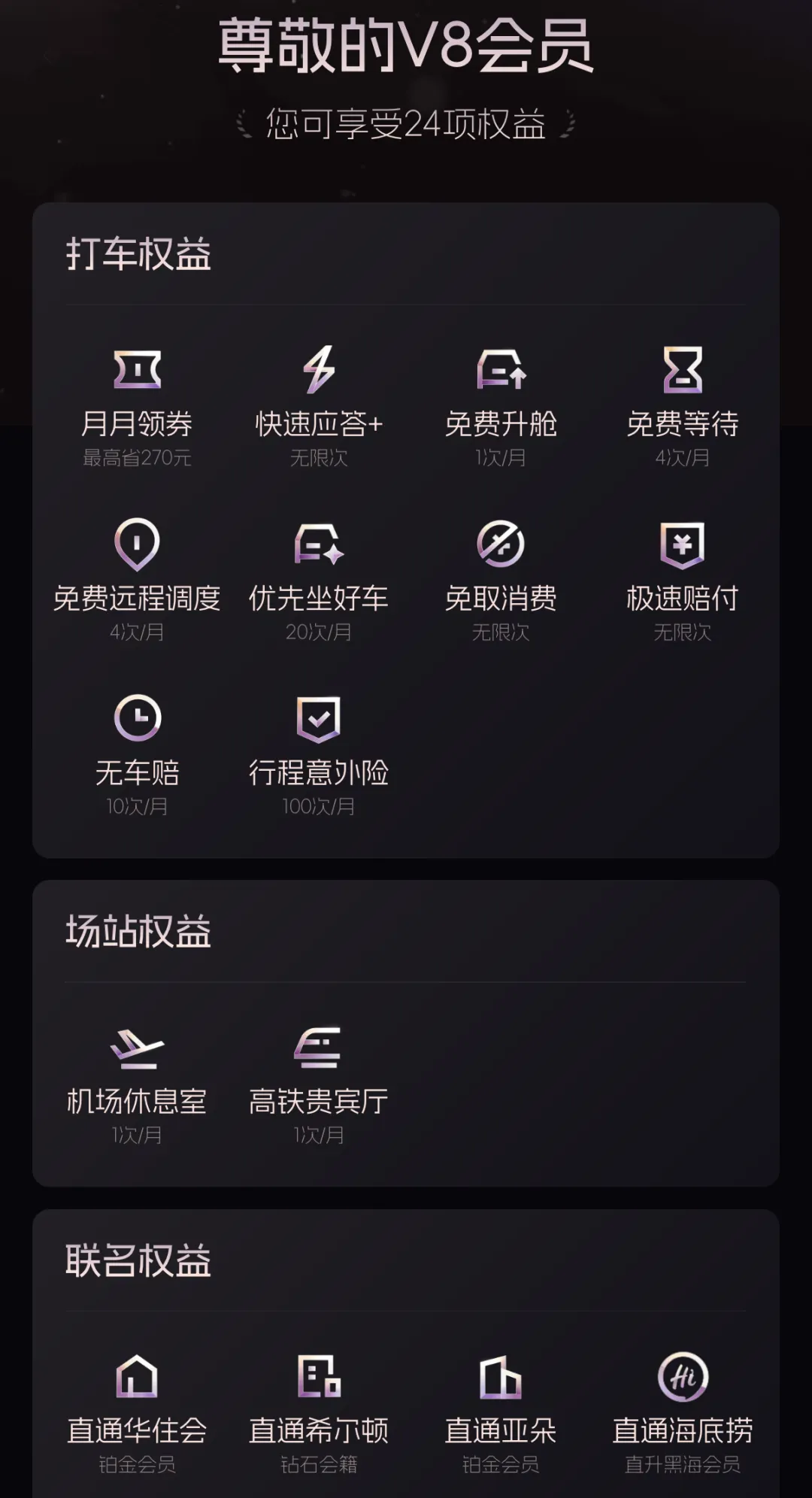 8月份帅帅写了,当时评论区被求V7礼遇卡的小伙伴占领,真的好久没这么热闹了。不过这也难怪,滴滴会员这么一升级:增加了机场高铁贵宾厅、月月领打车券等权益,确实进一步提升了出行体验。而且还能匹配希尔顿钻石、海底捞黑海等高端会籍,香到爆。