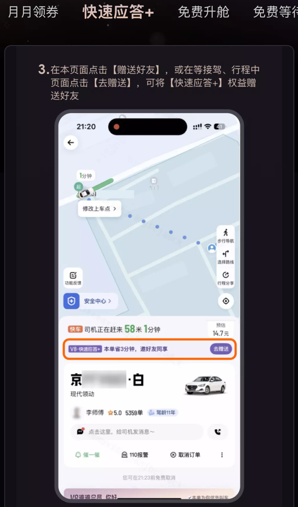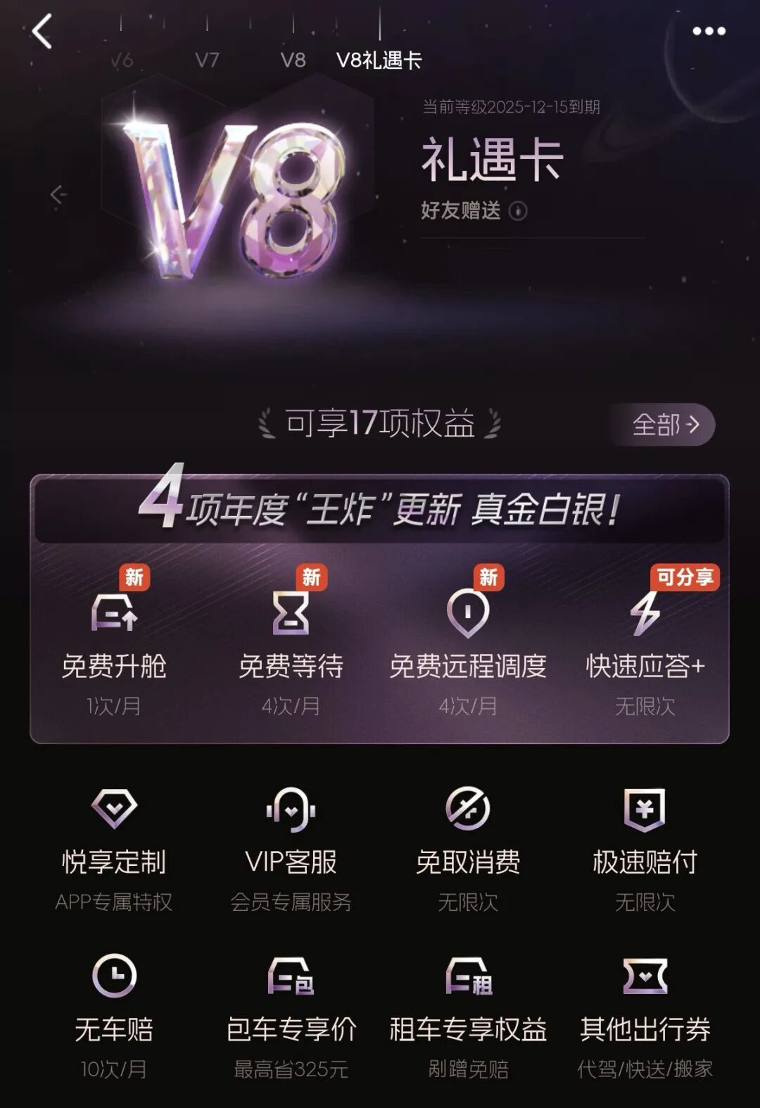 直接在软件里把权益分享给他,即便她只是V3会员,也能用上“快速应答+”。V7每月能分享5次,V8能分享10次。平时家人、朋友打不到车,直接分享给他们就好了。
