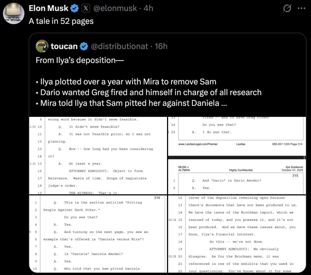 马斯克似乎并不想翻篇,转发了一位博主 po 出的 Ilya 最新证词的帖子,称这是「一个 52 页的故事」。