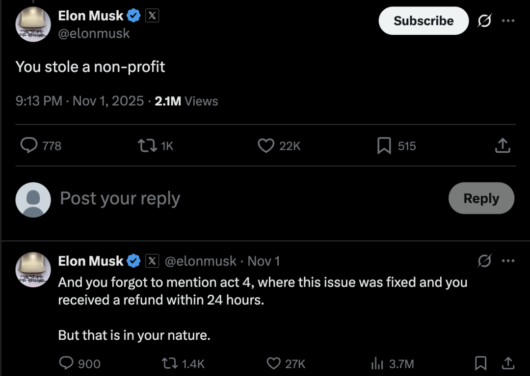随后,马斯克回复奥特曼,「你忘了提第四幕,这个问题在第四幕中得到了解决,你在 24 小时内就收到了退款,但这是你的本性」,并旧事重提,指责奥特曼「你偷了一家非营利组织。」