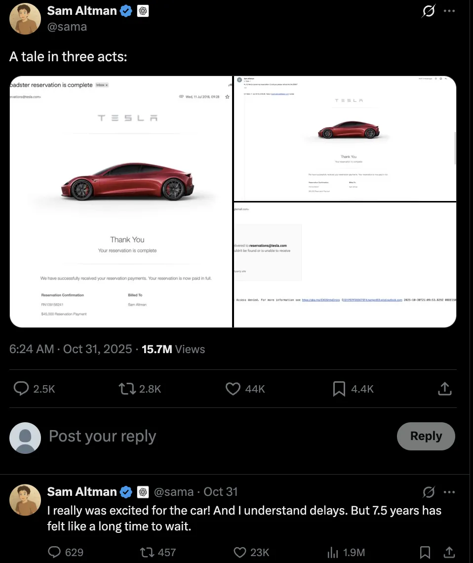 图片显示,2018 年 7 月,奥特曼支付 4.5 万美元预订了 Tesla Roadster,在等待 7.5 年(从 2018 年到 2025 年 10 月)且 Roadster 仍未交付的情况下,奥特曼决定取消预订并索要退款。