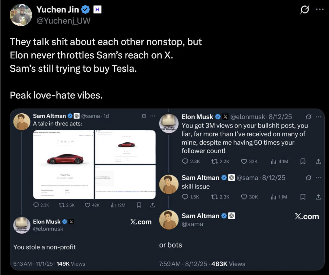 这已经不是马斯克和奥特曼第一次在 X 上打嘴仗了,有网友调侃「他们不停地互相诋毁,但是马斯克从未限制过奥特曼在 X 上的影响力,奥特曼还在努力想买特斯拉,这俩人爱恨交织的情绪达到了顶峰。」