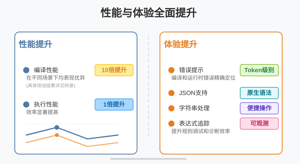 * **性能方面**:编译效率提升约10倍,执行效率提升约1倍。这得益于将自研语法分析器更换为Antlr4,并优化了虚拟机指令集,显著降低了内存和执行开销。