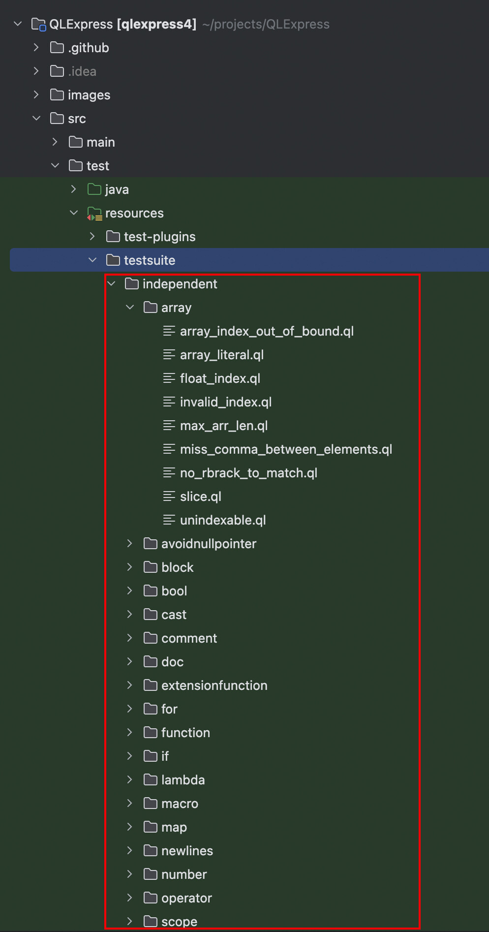 在源码的 src/test/resources/testsuite 目录存放了我们的测试套件,按特性划分目录,给每个特性都准备了最经典的几个测试用例,确保场景覆盖率 100%: