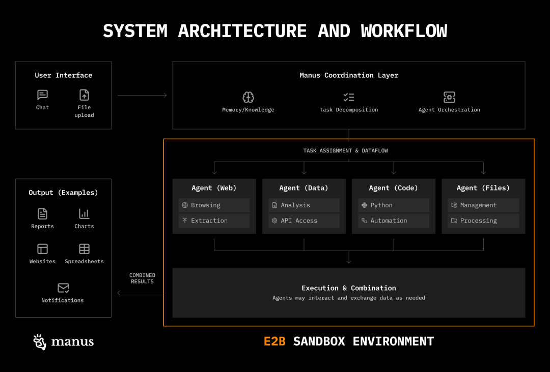 每次 Manus 会话都会使用一台专用的云端虚拟机,为智能体提供一个虚拟计算环境,包括文件系统、用于操作文件的工具,以及在沙箱环境中执行命令(例如内置工具和标准 shell 命令)的能力。