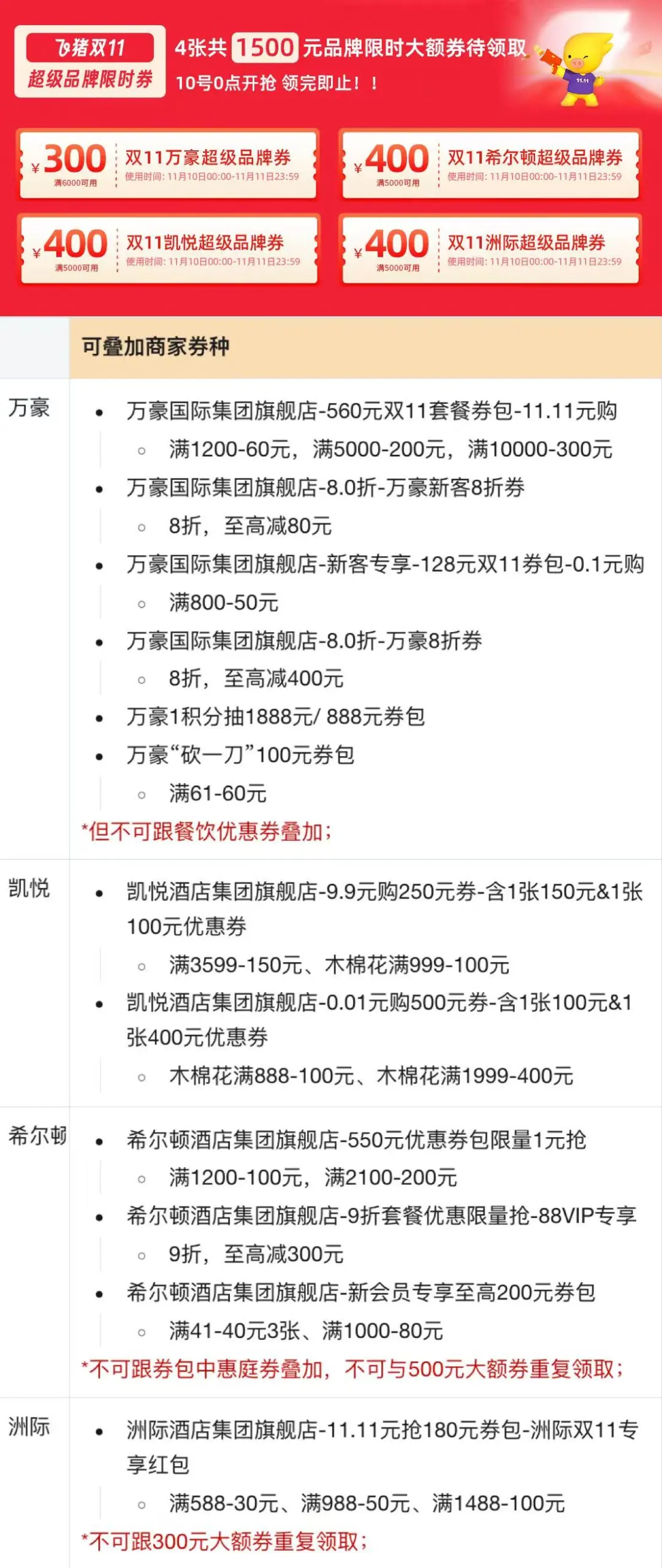 1. **组合性优惠**:例如万豪最高可叠加6000-800、希尔顿最高5000-700的店铺券,可与其他促销叠加使用。