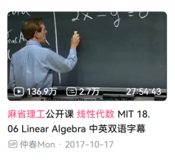 3、Strang教授的公开课在B站、MIT官网都很多,方便大家学习。想想看,这种高质量的免费在线课程,对传统大学教育冲击大吗?或者说,它对想自学的人来说,是不是一个巨大的福音?