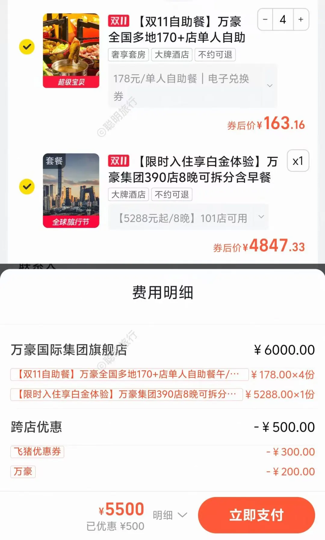 选择「1份5288档 + 4份178元自助餐」加入购物车,刚好满6000减500。