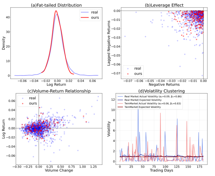 研究者选择了四个著名的"Stylized Facts"(风格化事实)——真实市场普遍展现、但传统模型难以同时复现的统计特征进行检验,并发现TwinMarket成功复现。