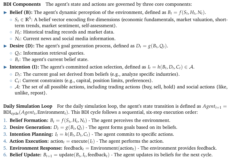 TwinMarket的核心创新是引入了Belief-Desire-Intention(信念-愿望-意图)认知框架。这不是简单的技术选择,而是一次范式转变:从"规则匹配"到"认知推理"。