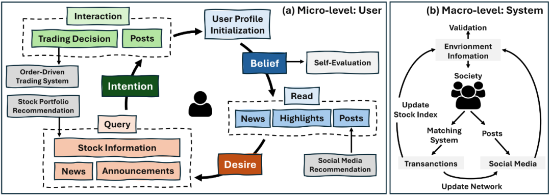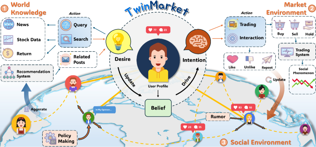 TwinMarket 的核心在于其范式转变:从预设规则的“刺激-反应”模式转向基于“信念-愿望-意图”(BDI)的认知推理框架。这个三层结构让虚拟投资者能够理解世界(Belief)、设定目标(Desire),并据此制定行动(Intention),每次行动后还能进行自我反思和认知更新。不同于传统模型的行为同质化和社交互动缺失,TwinMarket通过逼真的用户画像初始化(基于雪球平台真实数据提取的投资风格和行为偏差),以及实时接收新闻、公司公告、社交媒体热帖等市场信息,构建了一个高度仿真的市场环境。其订单驱动的交易系统严格遵循A股规则,使得价格完全由供需关系内生决定,确保了市场动态的真实性。