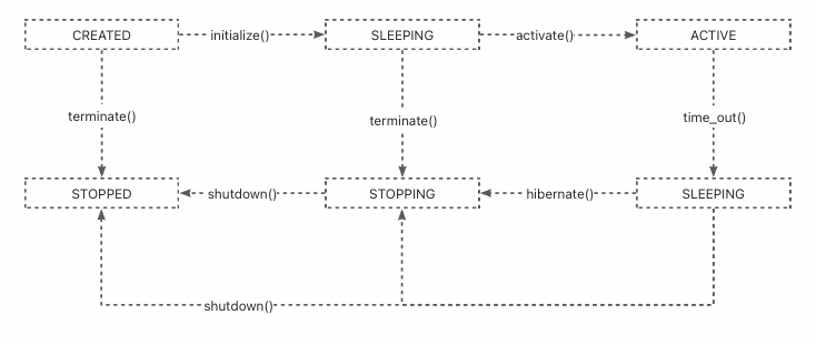 在我们的系统中,一个Agent是一个线程。在Agent运行过程中,将会在线程池中,同时运行各个Area和Act。其生命周期如下图所示: