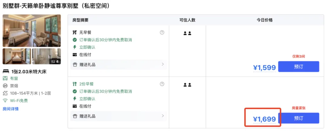 同款别墅面积108平米起,周六的日历房价约1700元/晚,套餐即使有加价,也只有5折,还再送双人月亮温泉门票。