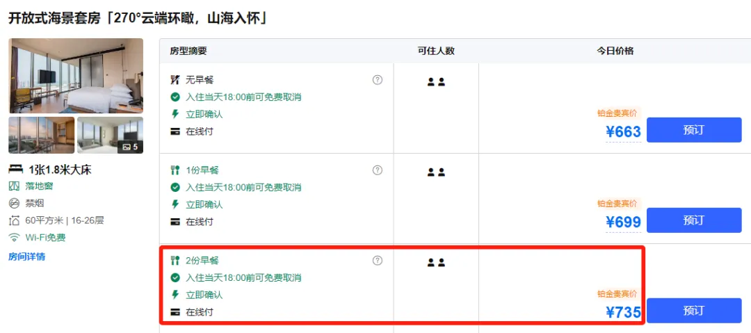 套餐额外送房券1张,所以999元能住3晚,还能用满998-100的券,券后299元/晚,仅日历房价45折。