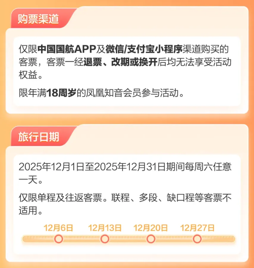 仅限通过中国国航APP及微信/支付宝小程序渠道购买的机票,才符合活动要求,且退改机票无法参加。