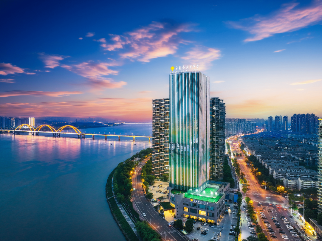 饭店位于湘江与浏阳河两江交汇处,坐拥180度全江景视野,与长沙市地标建筑“三馆一厅”仅隔河相望。