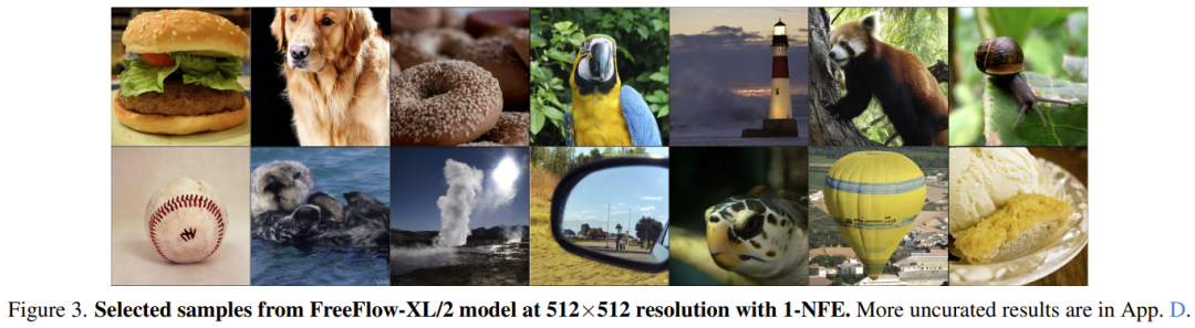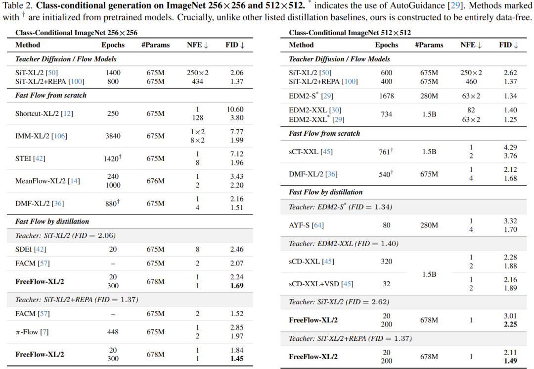 通过从 SiT-XL/2+REPA 教师模型进行蒸馏,FreeFlow 刷新了最佳成绩:在仅需 1 次函数评估(1-NFE)的情况下,其在 256×256 分辨率下达到了惊人的 1.45 FID,在 512×512 分辨率下达到了 1.49 FID,大幅超越了所有基于数据的基准模型。