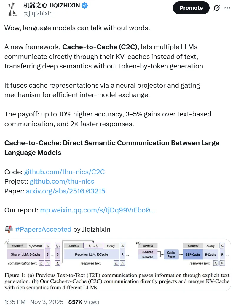 前些天,一项「AI 传心术」的研究在技术圈炸开了锅:机器不用说话,直接抛过去一堆 Cache 就能交流。让人们直观感受到了「去语言化」的高效,也让机器之心那条相关推文狂揽 85 万浏览量。参阅报道。