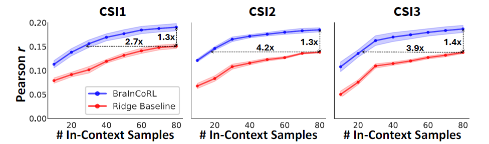 为解决这一挑战,BraInCoRL(Brain In-Context Representation Learning)提出一种基于元学习的上下文Transformer跨被试脑编码模型,仅凭少量示例图像及其对应的脑活动数据,即可无需微调地预测新被试在面对全新图像时的脑响应。该模型在多个公开fMRI数据集上表现出卓越的数据效率与泛化能力,甚至可跨扫描仪、跨协议进行有效预测。