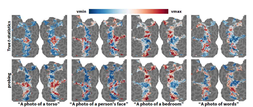 将 CLIP 文本提示(如 “a photo of a person's face”)映射为图像嵌入,输入 BraInCoRL,即可零样本预测整个皮层的激活图。