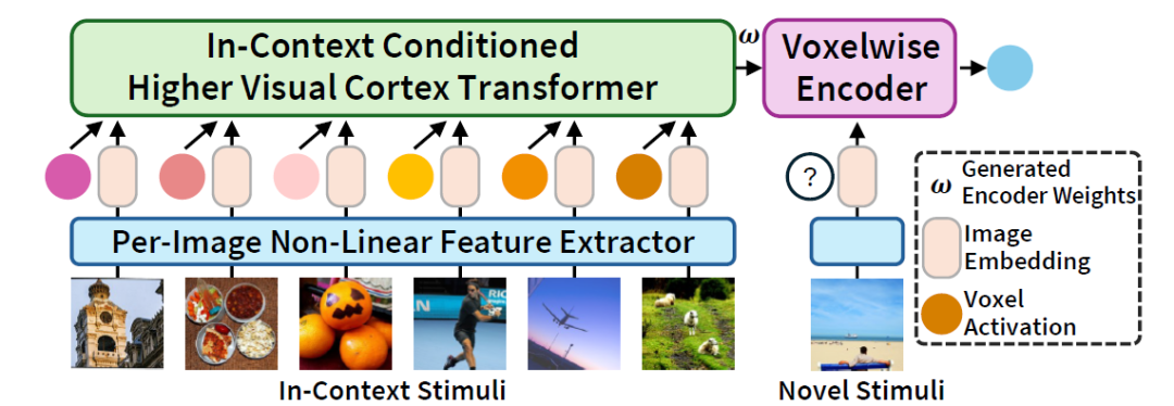 针对这一瓶颈,本文提出一种全新的建模范式:将每个脑体素(voxel)视为一个独立的、从视觉刺激到神经响应的响应函数。fMRI 测量仅提供该函数在有限输入下的带噪采样,而训练目标是从这些稀疏观测中推断出一个可计算、可泛化的映射。基于元学习和上下文学习范式,本文提出一种全新的BraInCoRL脑编码架构,在训练阶段从多被试数据中学习视觉皮层响应的共享结构;在测试阶段,仅需提供极少量(如 100 张)新被试的图像-脑响应对作为上下文,即可无需任何微调,直接生成适用于该被试的体素级编码器,并准确预测其对全新图像的神经活动。