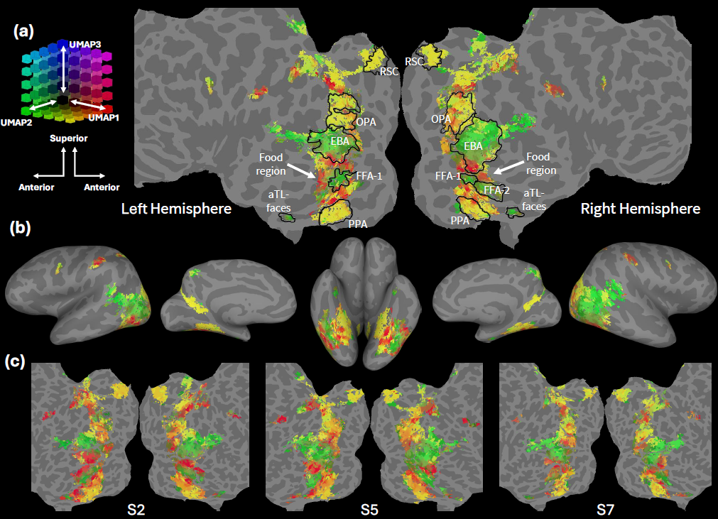 在 UMAP 可视化中,BraInCoRL 生成的体素权重呈现出清晰的语义聚类,人脸、场景、身体、食物等功能区域各自形成独立簇,且在多个被试间稳定复现。