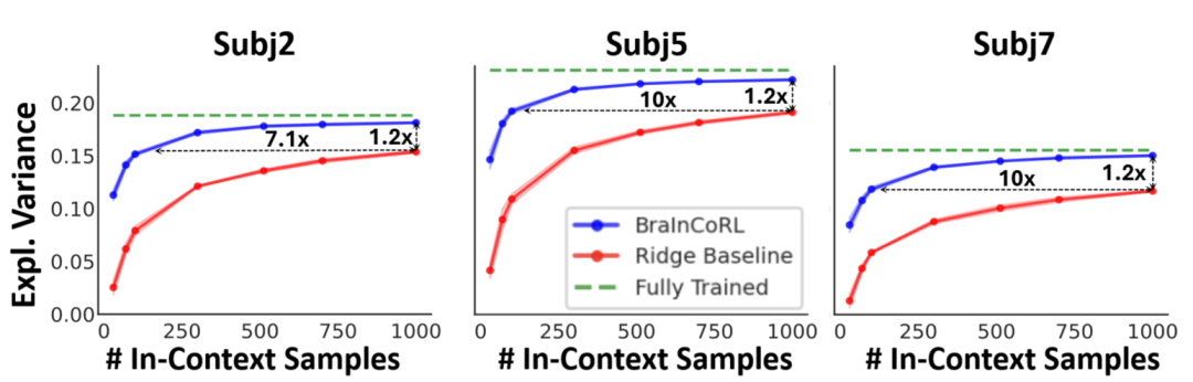 在Natural Scenes Dataset (NSD)数据集 上,BraInCoRL仅使用100张上下文图像,即在多个类别选择性脑区(如面孔、地点、身体、食物、文字)上达到与全量训练模型(9,000张图像)相近的解释方差,显著优于基于相同样本量的岭回归基线。同时在上下文数量变化的情况下,模型也表现出强大的稳定性。