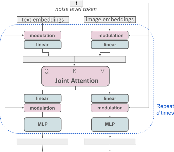 SD3 架构基于 Sora 核心研发成员 William Peebles 和纽约大学计算机科学助理教授谢赛宁合作提出的 DiT。由于文本嵌入和图像嵌入在概念上有很大不同,因此 SD3 的作者对两种模态使用两套不同的权重。如上图所示,这相当于为每种模态设置了两个独立的 transformer,但将两种模态的序列结合起来进行注意力运算,从而使两种表征都能在各自的空间内工作,同时也将另一种表征考虑在内。