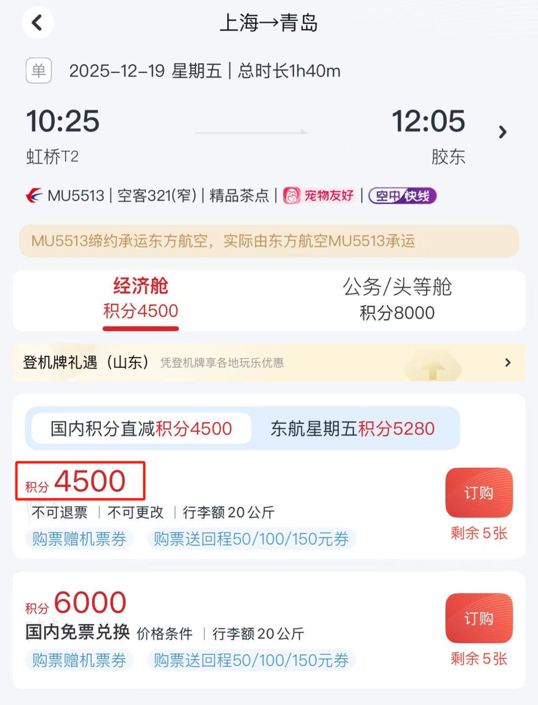 比如上海-青岛,单程标准兑换6000里程,75折兑换只要4500里程: