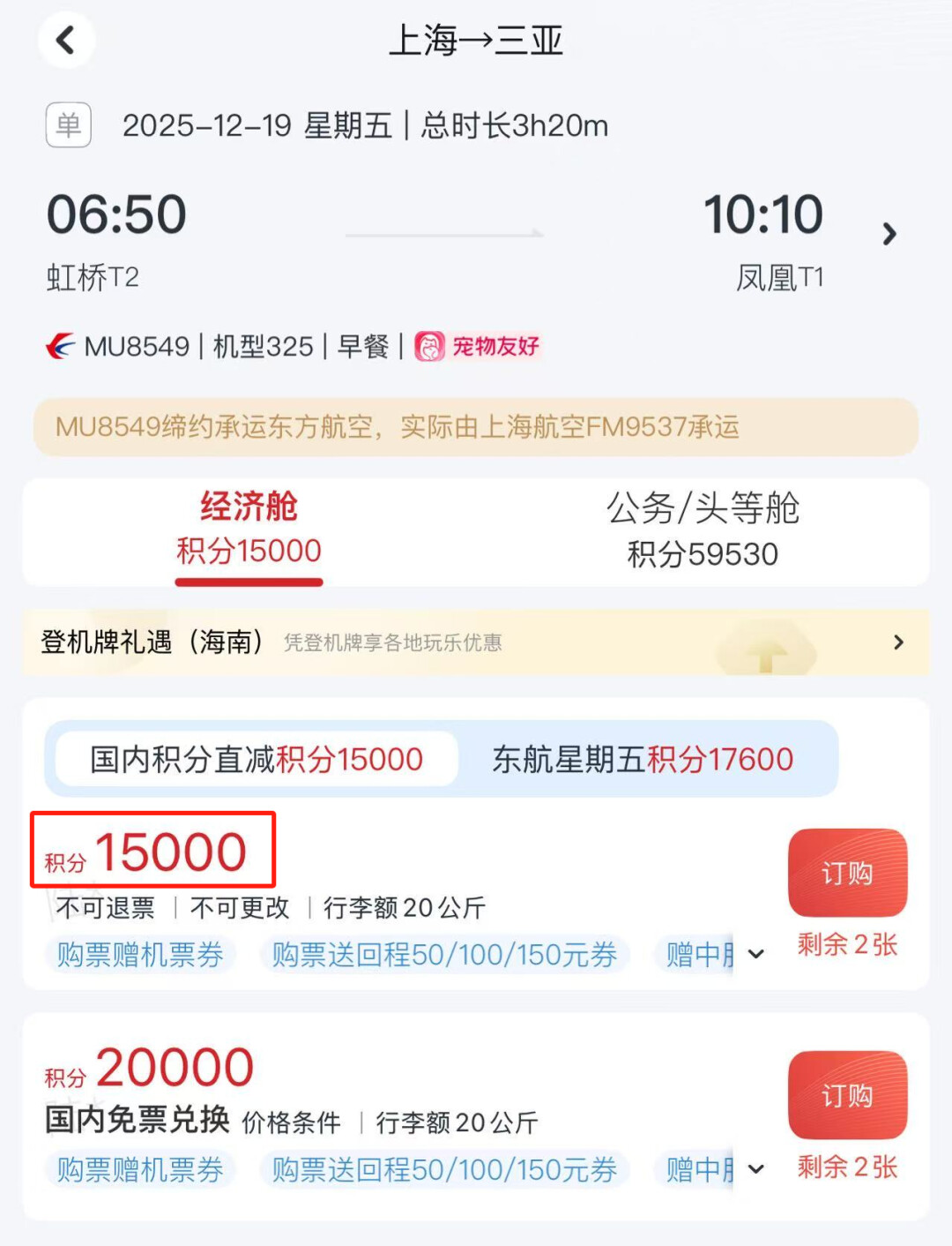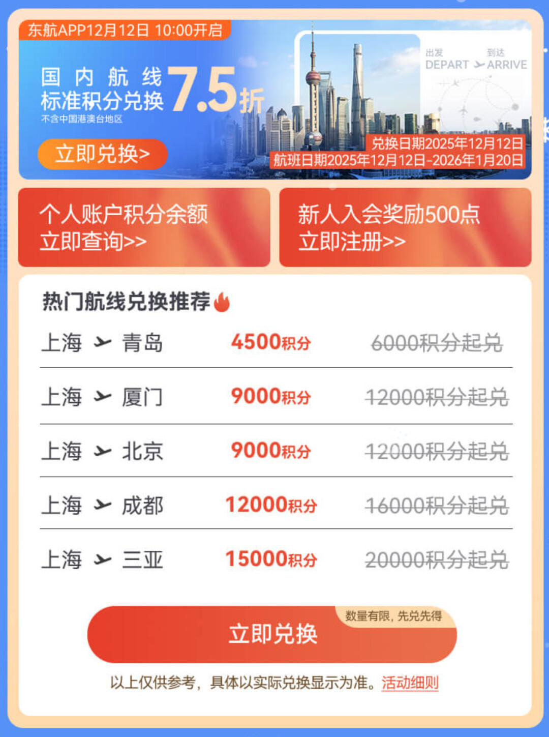 第二项活动是**东方航空里程票75折兑换**,该活动已于12月12日24点结束。此次活动提供国内单程、往返航班(不含中国港澳台)经济舱X舱里程票的75折兑换,且票品不可退改。虽然折扣力度相比其他部分航司稍显逊色,但依然为里程持有者提供了节约里程的机会。 此次里程票的兑换航班日期覆盖至2026年1月20日,巧妙地包含了圣诞节、元旦等重要节假日以及多个周末。 用户可以通过东方航空APP查询指定国内航线的积分兑换详情,例如上海到青岛的单程票从标准兑换的6000里程降至4500里程,上海到三亚则从20000里程降至15000里程,有效降低了出行的里程成本。