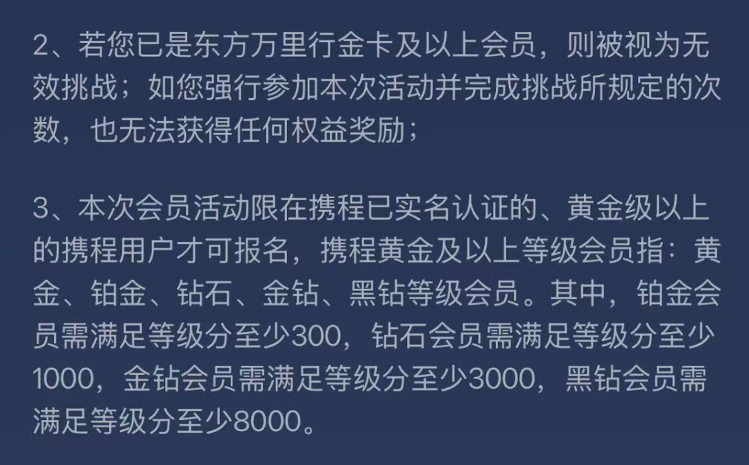 已经是东航金银卡的参加活动无法获得奖励,携程铂金及以上会员需要等级分达标才能报名。