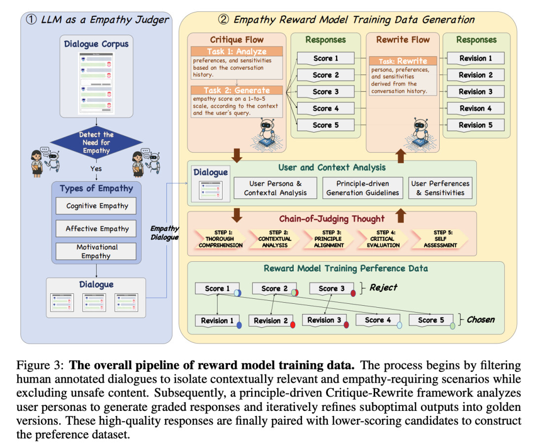 Empathy Reward(共情奖励): 旨在实现 User-specific 的深度共情。先根据历史上文来推断用户的潜在画像(User Context Mining),再判断回复是否符合人类认知、情感、动机三种最本质的共情需求。由于人类偏好的多样性,团队提出了一种「从公理推定理」的新颖范式:将普世价值观视为 “公理”,将千人千面的个性化需求视为 “定理”,由此出发设计了一套共情偏好数据合成框架。为了校验自动化管线生成数据的可靠性,团队引入了「人机回环」验证机制,通过让原始标注员对模型推演的用户画像与回复策略进行一致性校验,确保了合成数据在 “客观准确” 与 “主观共情” 上的高度统一。