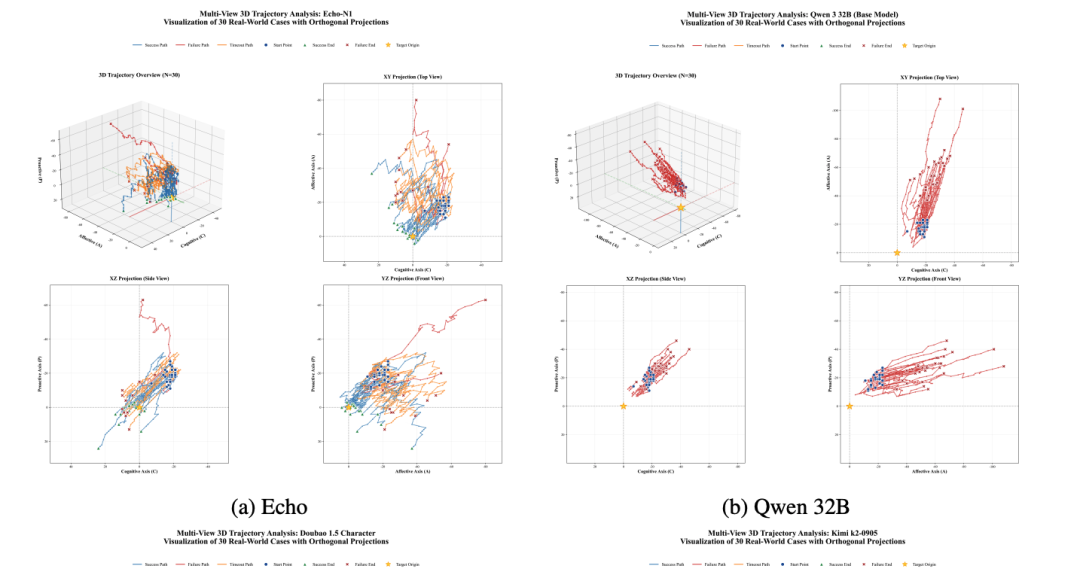 在覆盖 30 个高难度心理场景的压力测试下,未经 post-train 的基座模型 (Qwen3-32B) 全面崩塌,通过率为惊人的 0%。更具揭示性的是 EPM 3D 轨迹图:基座模型陷入无序的的随机游走和病态收敛,它的轨迹几乎全部指向了负能量区域 —— 不仅无法提供情感支持,反而让用户滋生了更负面的情绪和心理阻抗,在错误的道路上越走越远。
