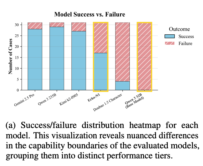 仅 32B 参数的 Echo-N1,在多轮情感陪伴任务中胜率(Success Rate)达到 46.7%。作为对比,拥有千亿参数量的商业模型 Doubao 1.5 Character,胜率仅为 13.3%。